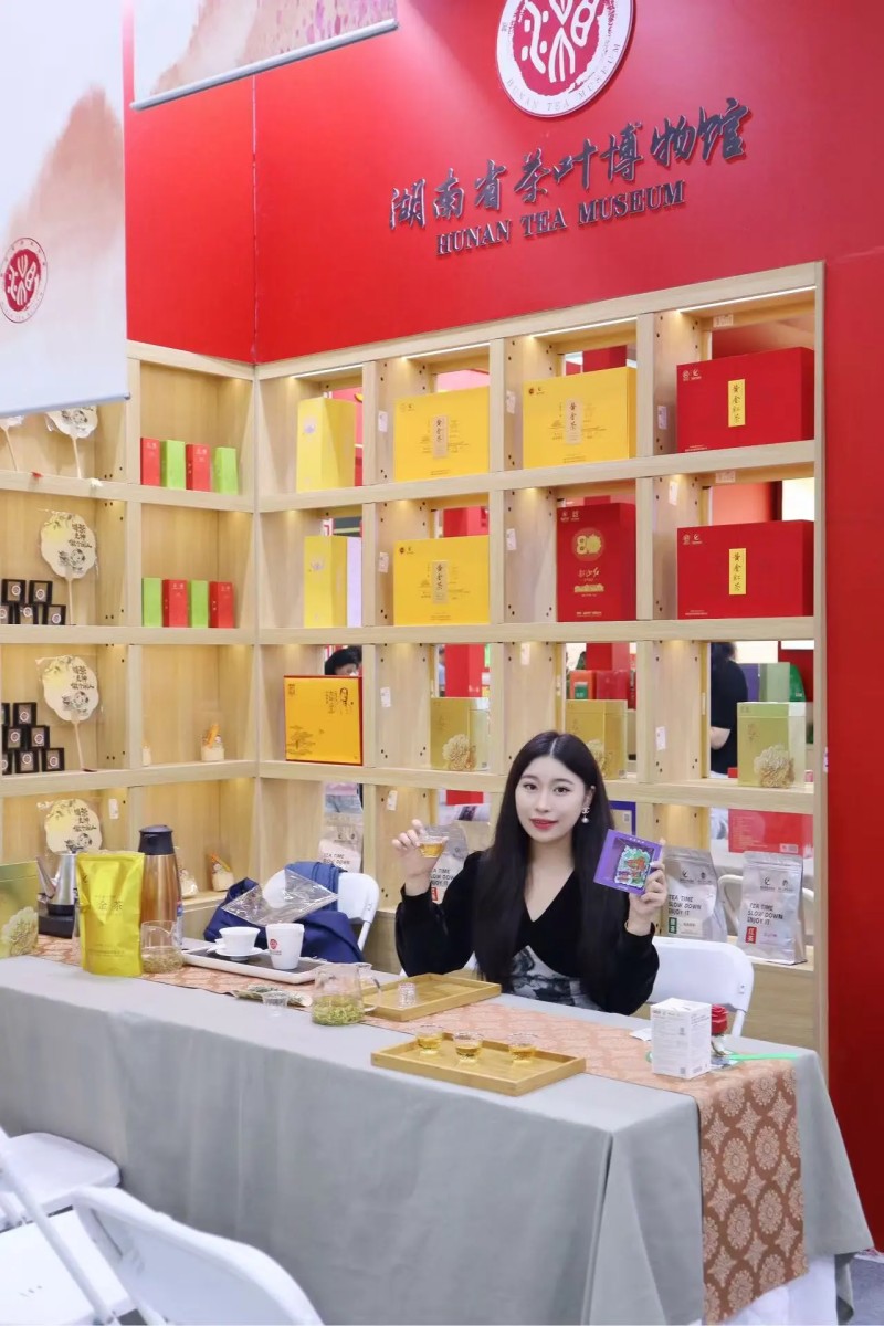 整個(gè)展位像個(gè)“湘茶小集市”:年輕人愛扎堆的茶守藝在這兒,能試喝湖南茉莉奶茶,茶禮五折起,冰激凌第二支半價(jià),玩投茶游戲還能贏茶香薰;旁邊湖南茶葉博物館很適合慢慢看,答茶題換文創(chuàng)扇、胸章,試喝國色天香紅茶,順便漲知識(shí)。