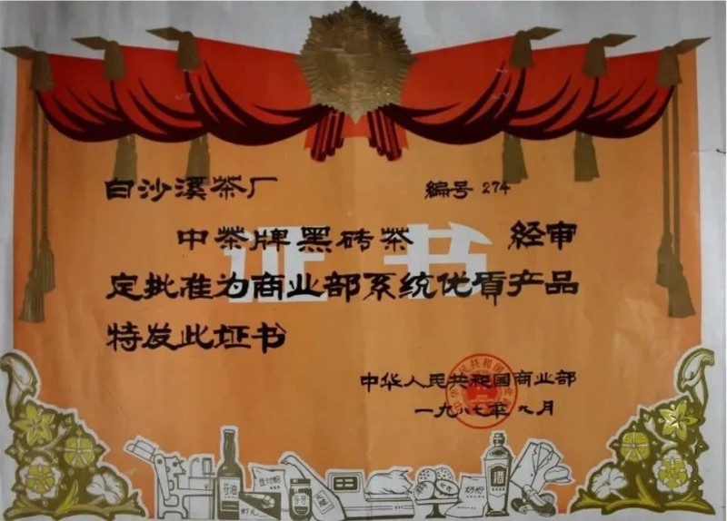 1987年,白沙溪茶廠黑磚茶被評為“商業(yè)部優(yōu)質(zhì)產(chǎn)品”;1988年,白沙溪茶廠生產(chǎn)的黑磚茶被授予“首屆中國食品博覽會銀獎”;1991年,白沙溪黑磚茶被評為“湖南省優(yōu)質(zhì)產(chǎn)品”;2005年,白沙溪黑磚茶獲“全國名優(yōu)茶評比茶邊銷茶金獎”;2007年,白沙溪黑磚茶獲得“第四屆中國國際茶業(yè)博覽會金獎”。