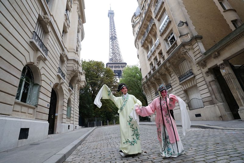 2023年9月13日,江蘇省演藝集團(tuán)昆劇院院長施夏明(左)和江蘇省演藝集團(tuán)昆劇院國家一級演員孔愛萍在法國巴黎埃菲爾鐵塔附近參加昆曲快閃。新華社記者 高靜 攝