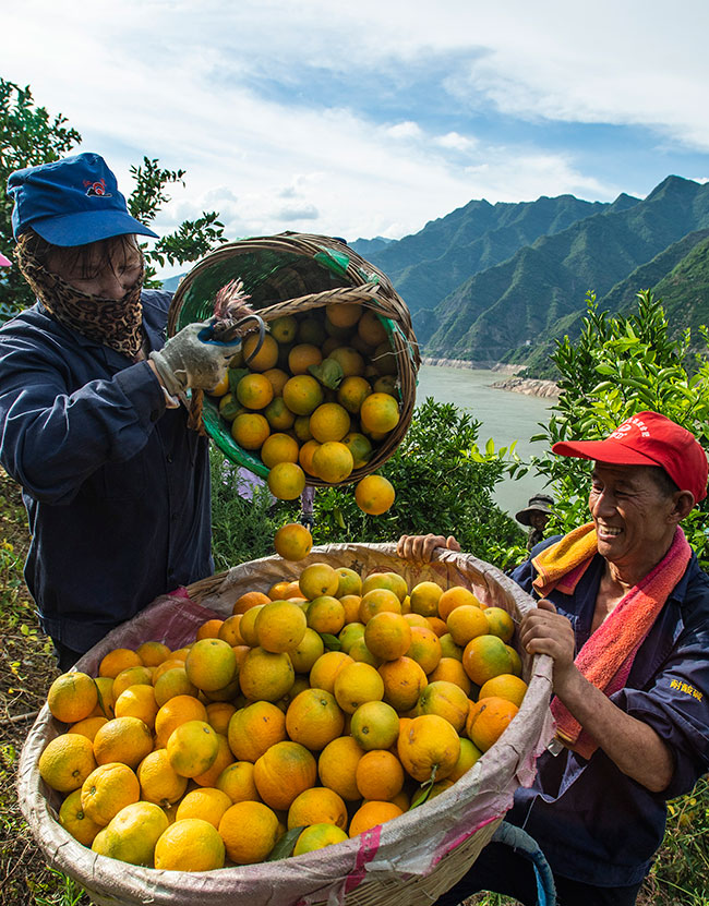 湖北省宜昌市秭歸縣沙鎮(zhèn)溪鎮(zhèn)臺(tái)子灣村村民在柑橘園里轉(zhuǎn)運(yùn)夏橙(2022年6月21日攝)。新華社發(fā)(鄭家裕 攝)