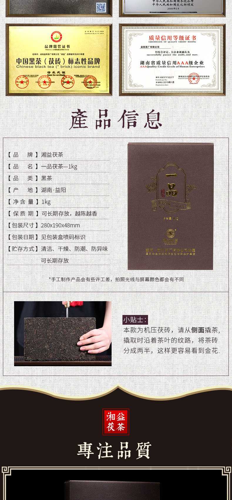 湘益獲茶湖南安化黑茶獲磚金花一品獲茶1kg益陽茶廠