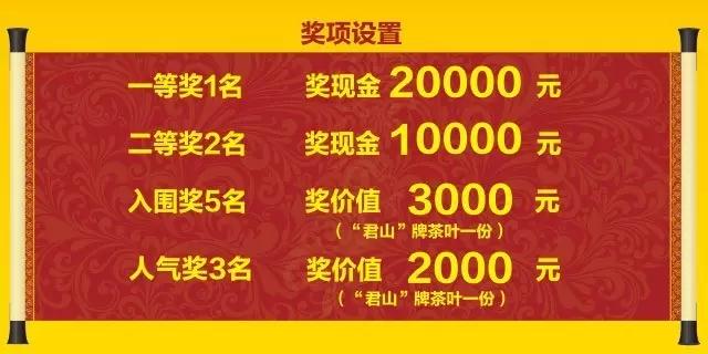征集活動(dòng)從即日起到2017年8月31日24時(shí)止,頒獎(jiǎng)時(shí)間為2017年9月中旬。本次征集活動(dòng)設(shè)一等獎(jiǎng)1名,獎(jiǎng)金20000元;二等獎(jiǎng)2名,獎(jiǎng)金10000元;入圍獎(jiǎng)5名,獎(jiǎng)價(jià)值3000元“君山”牌茶葉一份;網(wǎng)絡(luò)人氣獎(jiǎng)3名,獎(jiǎng)價(jià)值2000元“君山”牌茶葉一份。為增加與消費(fèi)者的互動(dòng),特設(shè)微信轉(zhuǎn)發(fā)推廣獎(jiǎng)200名,獎(jiǎng)價(jià)值100元的君山黃茶一份。