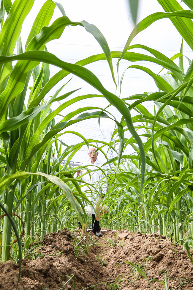 玉米育種專家程相文在海南三亞南繁科研育種基地觀察玉米生長(zhǎng)情況(2022年12月15日攝)。新華社記者 張麗蕓 攝
