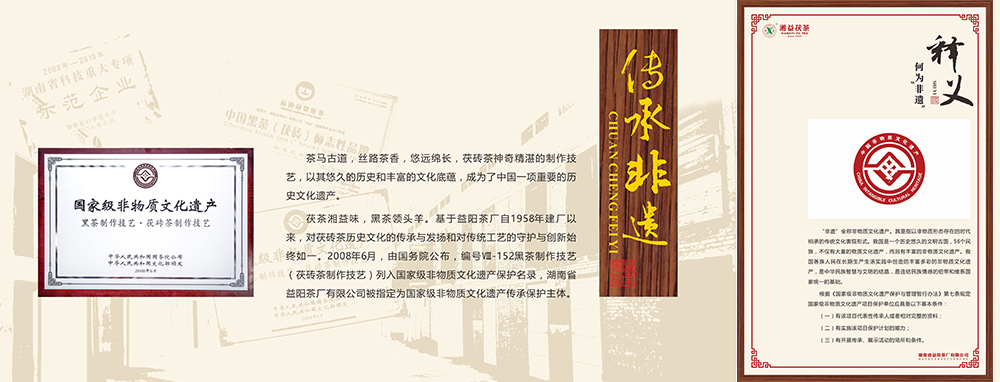 國家非物質(zhì)文化遺產(chǎn)傳承保護單位,2008年益陽茯磚茶制作技藝被列入國家級非物質(zhì)文化遺產(chǎn),而益陽茶廠是這技藝的唯一傳承保護單位。